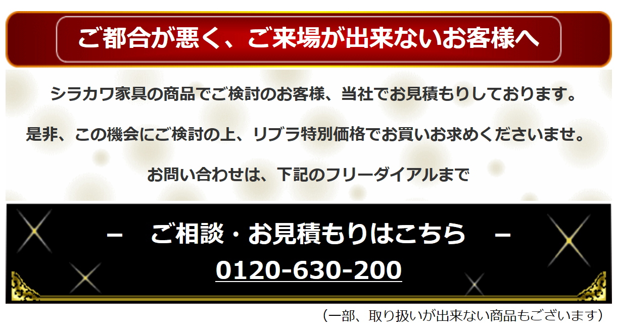 飛騨高山の家具 シラカワ家具の現品処分!売り尽くしセール開催!5月30日まで開催。埼玉県リブラショールームで開催される飛騨の家具シラカワ商品を特別価格で販売いたします。リブラ展示現品処分品も有り。天然の木目や質感を実感して 頂けるだけでなく、家具の選び方・お手入れ方法のアドバイス・家具レイアウトのご相談にお答えします。 もちろん、飛騨の家具の高品質な新品商品もフェアならではのリブラ特別ご優待価格で!この機会をお見逃しなく!