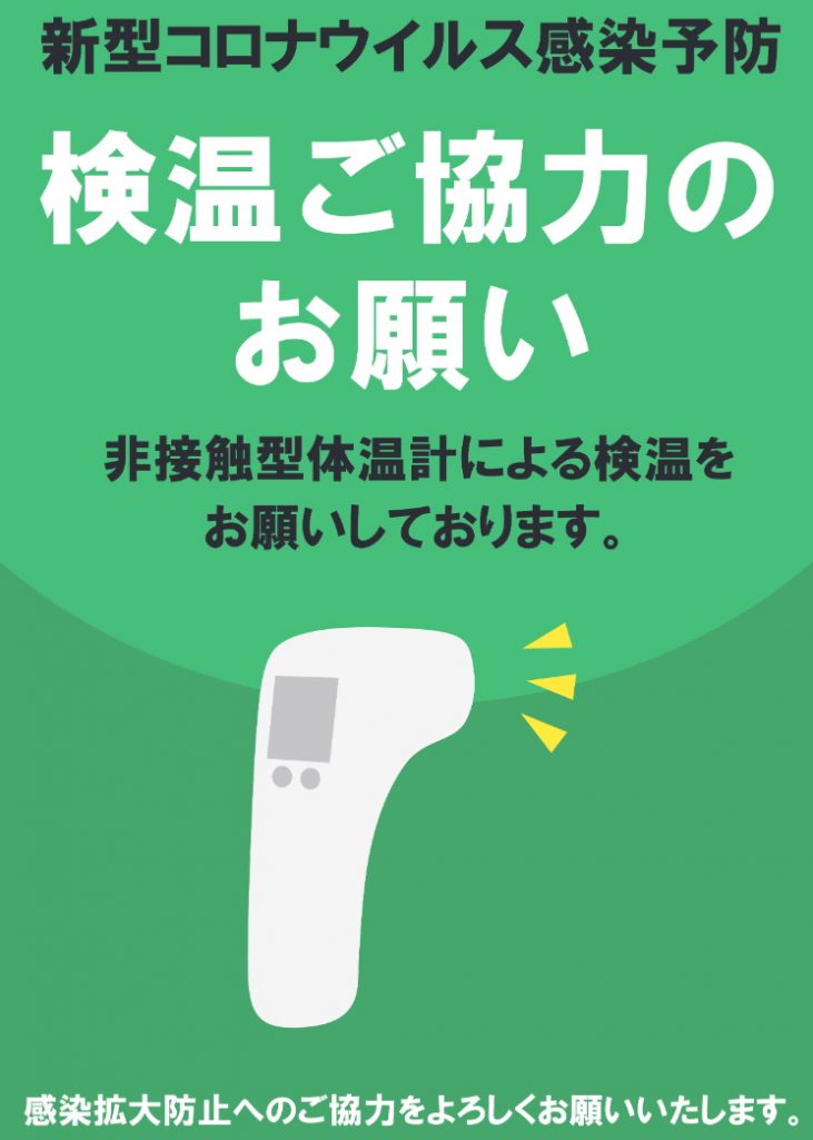 ◆ 新型コロナウイルスの感染が拡大している状況を考慮し、感染拡大防止の観点から以下の内容にて営業させていただきます。また、受付で検温のご協力をお願いしております。