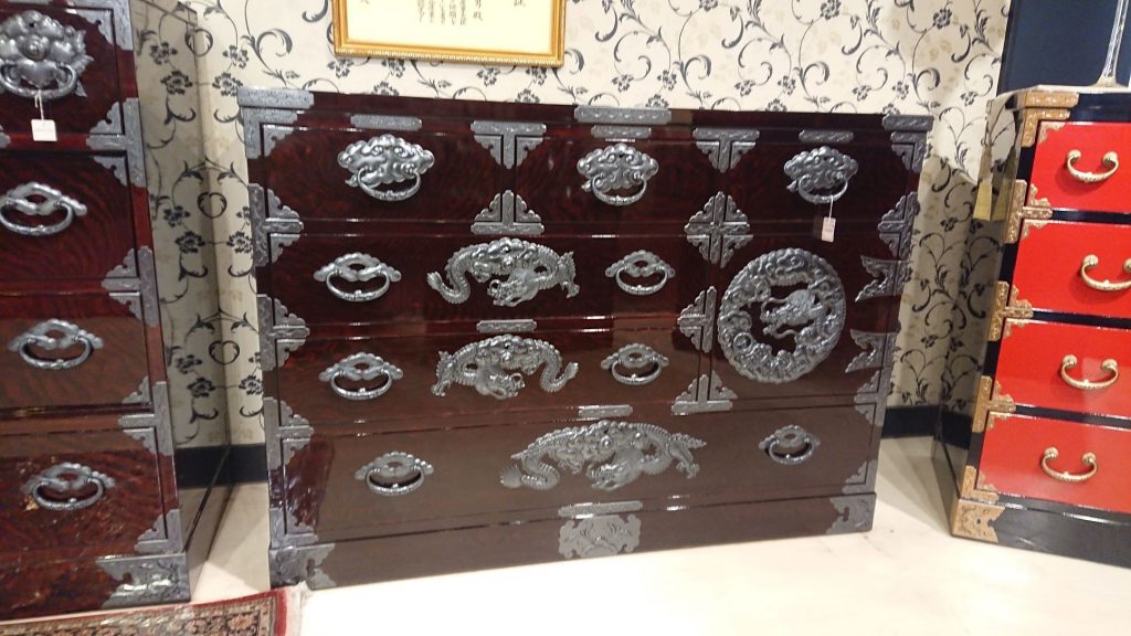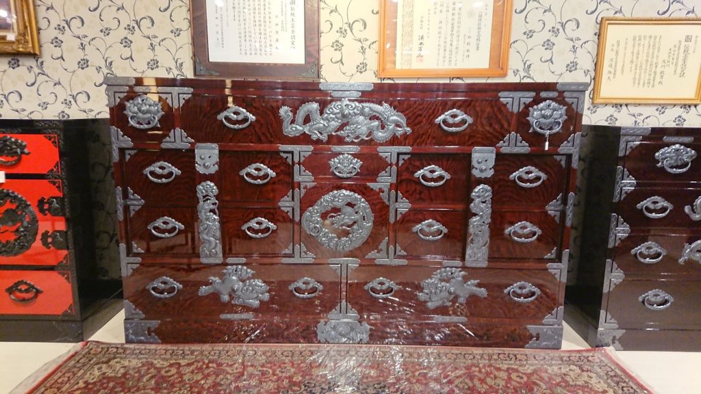 岩谷堂箪笥 最高峰の横長箪笥 (W168xD45xH100)、木地呂漆塗り・欅玉杢使用・手打ち金具(龍) リブラショールームにてご覧頂けます。関東最大級の岩谷堂ショールーム、現在ご成約を含め、約100本以上展示がございます。